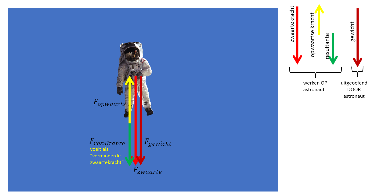 Stel ik zit in een vliegtuig. Mijn gewicht is op dat moment 700N. Ik spring uit het vliegtuig, de opwaartse kracht van de lucht is te verwaarlozen, mijn gewicht is nu véél minder. Bijna 'gewichtloos'. Maar tijdens het versnellen neemt de weerstand van de lucht kwadratisch toe met de snelheid. Mijn gewicht wordt dus steeds hoger, tot het punt waarbij ik mijn eindsnelheid bereik?