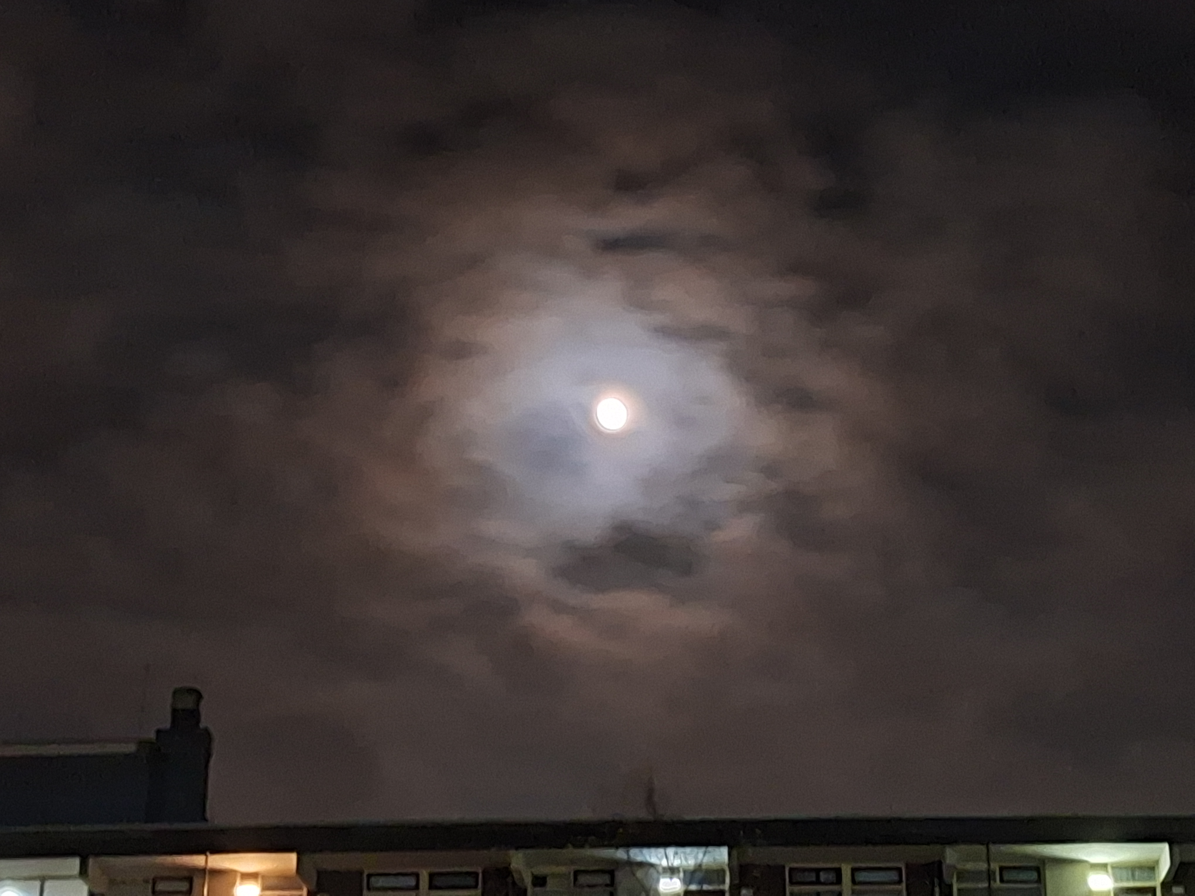 Wat je ziet is verstrooiing van het licht. De stralen van de maan gaan door waterdruppeltjes en worden daarbij een beetje afgebogen. Wanneer ze niet precies door het midden van een druppel gaan is er breking bij beide oppervlaktes. Dat is het sterkste bij een paar graden, een paar diameters naast de rechte weg van de maan naar jouw oog.