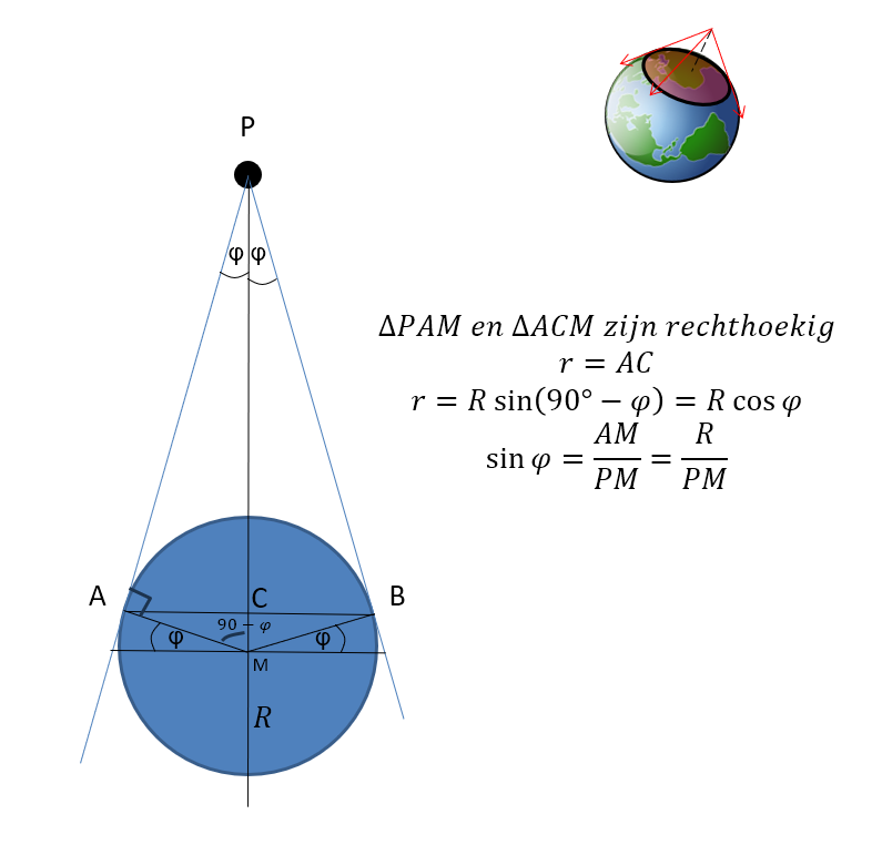 De straal is ook te bepalen uit de afstand tussen P en het middelpunt van de bal via wat goniometrie.