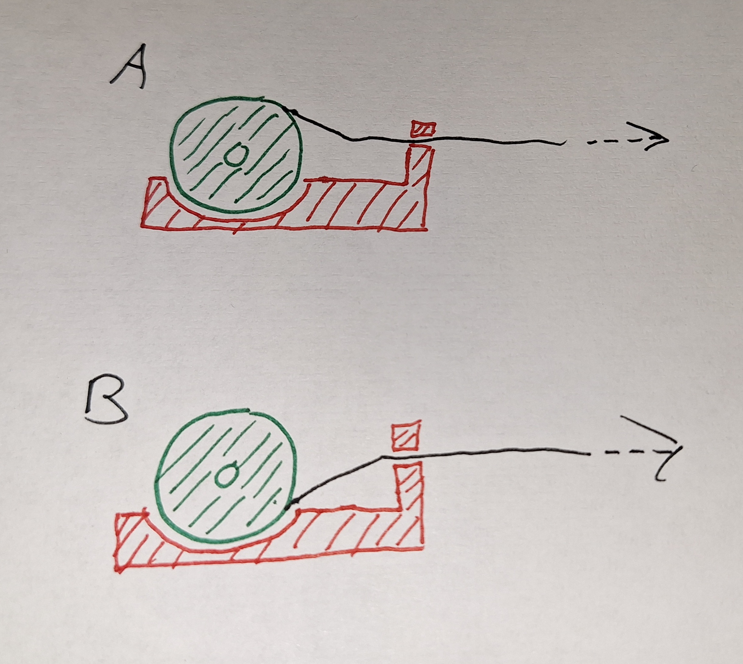 Daar waar het filament loskomt van de rol, heeft de spankracht die het filament op de rol uitoefent in situatie B een verticale component omhoog, zoals je zegt.