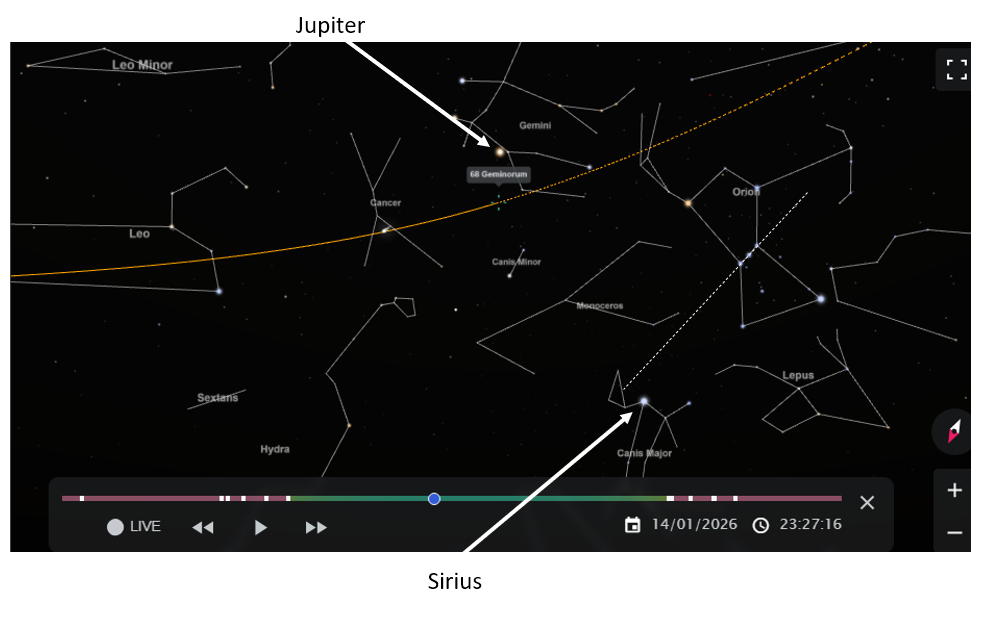 Ook Jupiter staat vanavond (14 januari 2026) zeer helder en in het sterrenbeeld Tweelingen, de hele nacht aan de hemel en is deze gemakkelijk te zien met het blote oog, het best rond middernacht in het oosten/zuid-oosten.