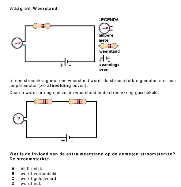 De stroomsterkte blijft overal gelijk , maar NIET wat die was. Want alles moet door dezelfde draden (geen splitsingen). Maar de weerstand in de draad verdubbelt. Met de Wet van Ohm, U = IR betekent dat dus
