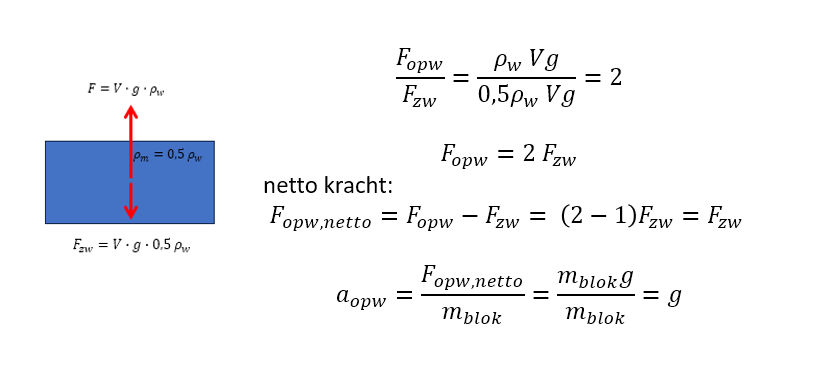 Met een blok dat de halve dichtheid heeft van het verplaatste water, is de opwaartse kracht dus 2x zo groot als de zwaartekracht naar beneden. Netto opwaartse kracht gelijk aan de zwaartekracht op het blok. F = ma ofwel a = F/m en als F = mg dan is a = mg/m = g.