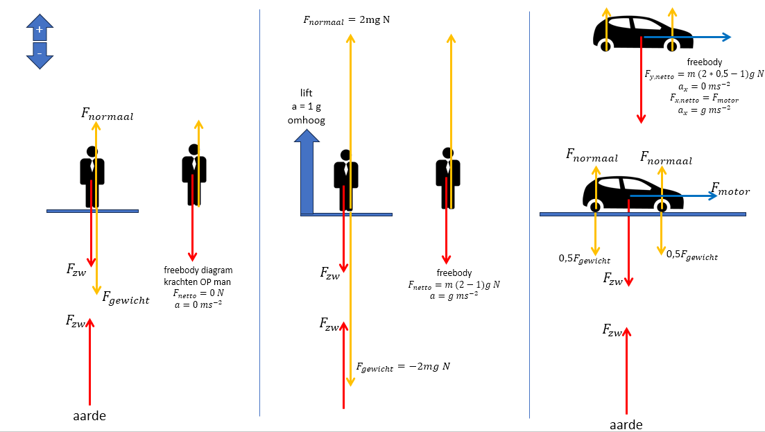 je voorbeelden: stilstaande lift 0g, met 1g omhoog versnellende auto 1g (zie tekening - eigenlijk is Fmotor de kracht die de grond op de wielen uitoefent, de motor (wielen) oefenen een gelijke tegengestelde kracht uit op de weg. Voor freebody telt alleen de kracht die de grond uitoefent op de wielen).