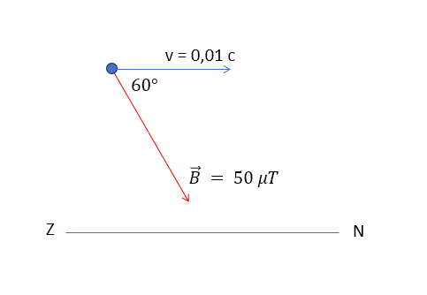 "een elektron vliegt (v=c/100) door belgie van zuid naar noord. Het magnetisch veld is 50microtesla, inclinatie is 60°. Hoe groot is de kracht die het elektron ondervindt? Wat is de zin van de kracht? (Noord,zuid, oost, west, onder of boven?) Maak een duidelijke tekening"