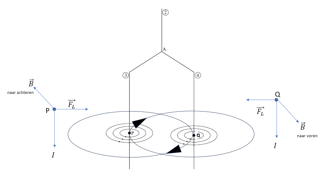 Pas bij de lorentzkracht in P gebruik je de richting van de stroom in P (zelfde als in Q) en het magnetisch veld in P (tegengesteld gericht aan de richting in Q).