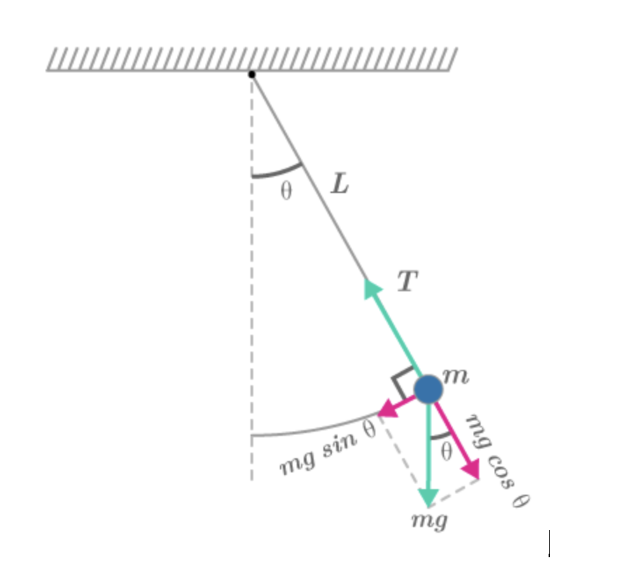Ontbind de zwaartekracht $F_\text{z}$ in een component $F_\text{z,1}$ langs een raaklijn aan de cirkelboog en een component $F_\text{z,2}$ loodrecht erop.