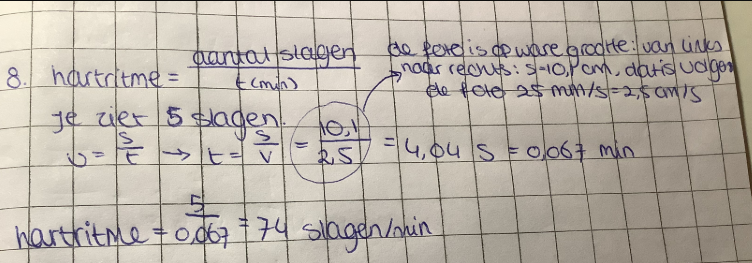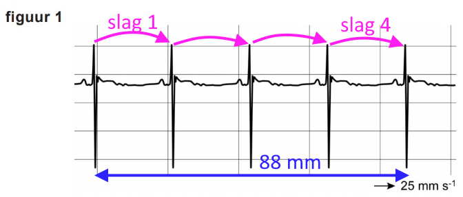 Dan bereken je de tijd in minuten per 5 slagen, dat is op zich een correcte aanpak, maar dan met 4 slagen per 0,0673 minuten komt neer op 59(,4) slagen per minuut.